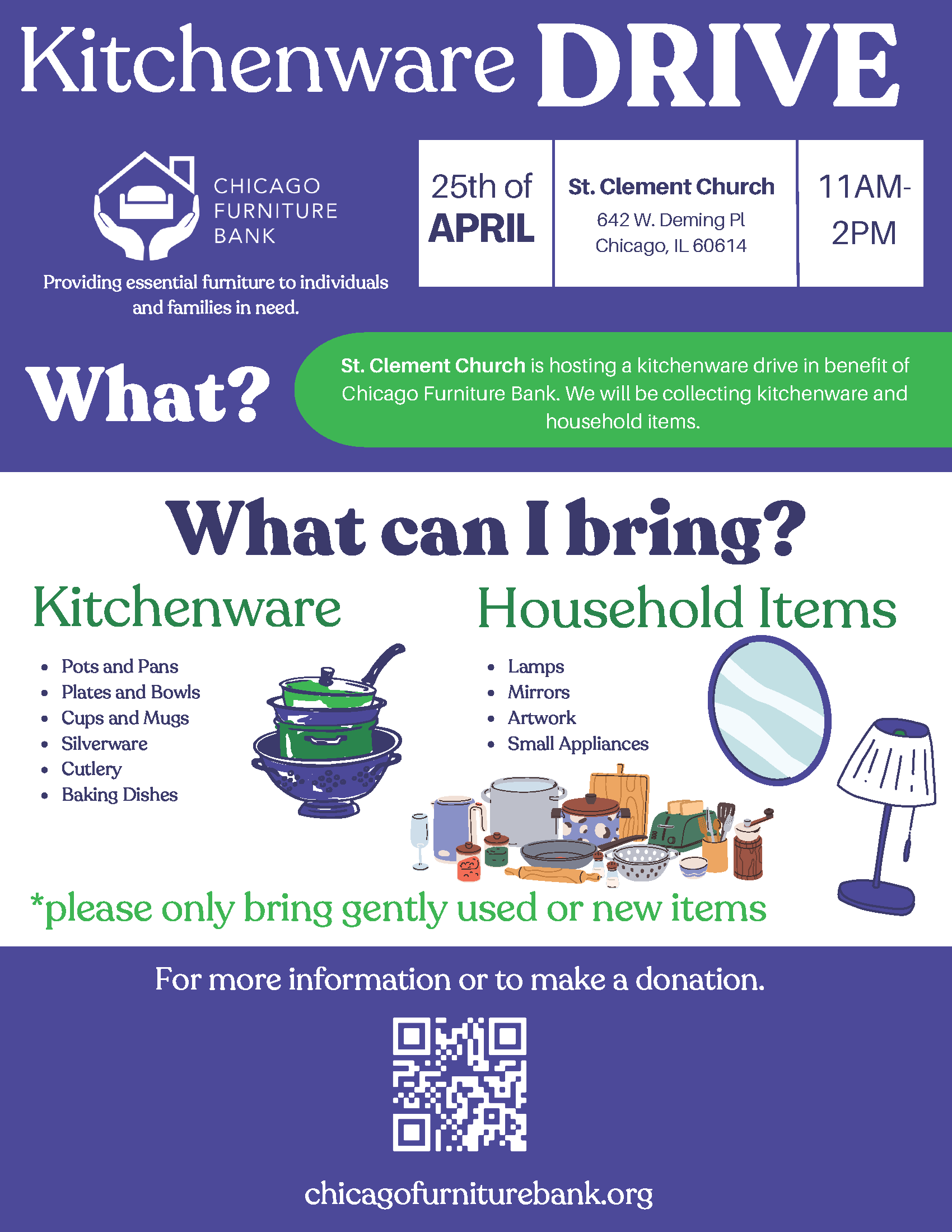 We once again are holding a Kitchenware Drive from 11 a.m.–2 p.m. on Service Day (4/25). This drive is held partnership with Chicago Furniture Bank which provides essential furniture to individuals and families in need. Bring your gently used or new household and kitchenware items. This will be a convenient drive up and drop off opportunity. Please note, we will only be able to accept items during the designated time.